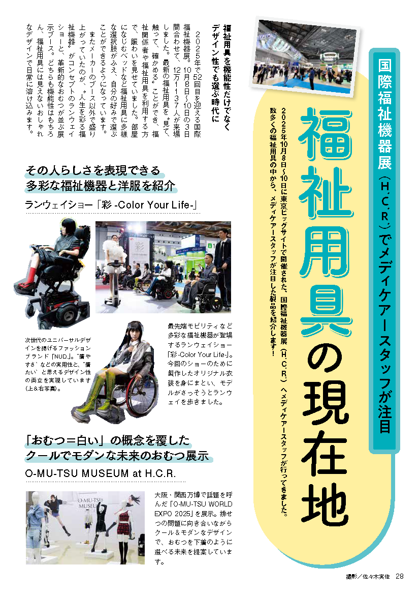 2025.12.10めりぃさん 国際福祉機器展(H.C.R.)でメディケアースタッフが注目 福祉用具の現在地 2025年10月8日~10日に東京ビックサイトで開催された、国際福祉機器展(H.C.R.)へメディケアースタッフが行ってきました。数多くの福祉用具の中から、メディケアースタッフが注目した製品を紹介します!